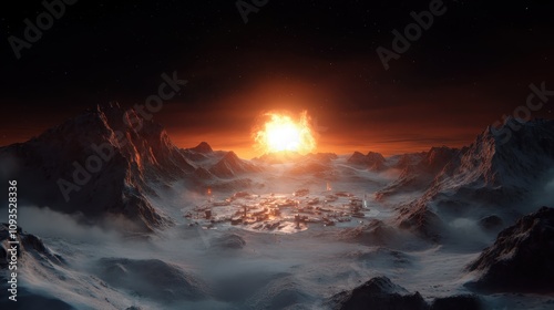 Naklejka premium A massive explosion illuminates a desolate snowy landscape surrounded by jagged mountains, representing desolation, destruction, and the power of nuclear forces.