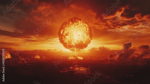 © h4kunA, Obraz premium A massive fiery explosion in the sky above a city, with plumes of smoke and a fiery glow in the clouds.