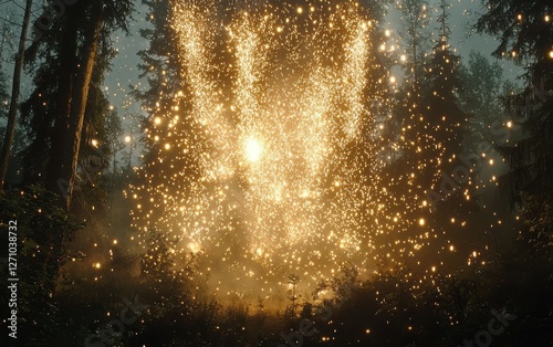 © Sergey Fedchenko, Fototapeta premium A massive firework explosion with golden sparks raining down