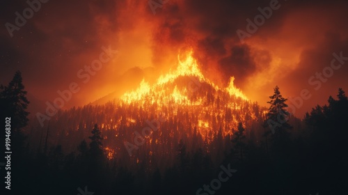 Naklejka premium A massive forest fire engulfs a mountain at dusk