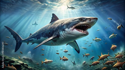 Fototapeta premium A massive prehistoric shark, with razor-sharp teeth and a powerful tail,...
