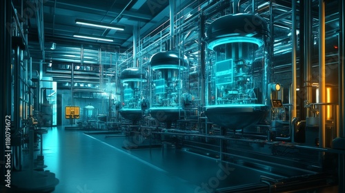 Fototapeta premium A massive vaccine production facility glowing with advanced filtration and automated injection systems