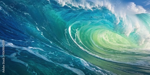 © Theerawat, Fototapeta premium A massive wave crashes and curls, revealing a vibrant turquoise and green interior, its crest illuminated by a bright sunlight, creating a stunning natural spectacle.