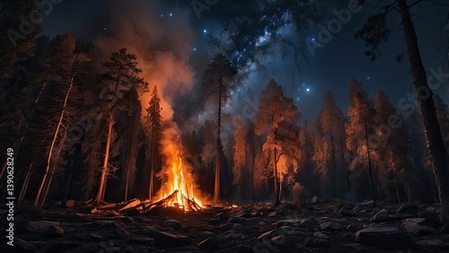 © MST, Obraz premium A massive wildfire engulfs a dense forest on a mountainside
