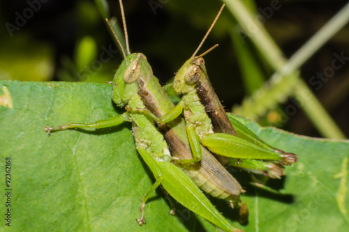 Fototapeta premium A mating pair of green grasshopper on leaf