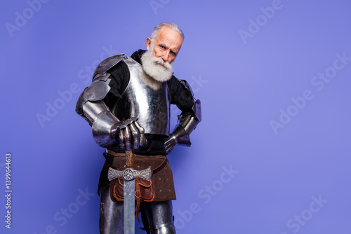 © deagreez, Fototapeta premium A mature bearded man wearing medieval armor standing confidently against a purple backdrop