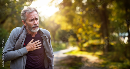 Obraz premium A mature man, bathed in sunlight, clutches his chest in pain, a stark depiction of a sudden heart attack or pressing health issue, capturing a moment of vulnerability.