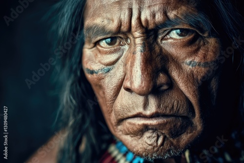 © Elena, Obraz premium A mature Native American man with a serious and contemplative expression, set against a dark background.