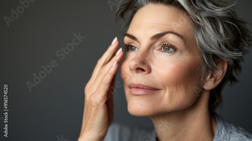 Fototapeta premium A mature woman applying moisturizer to her face, highlighting her smooth skin and graceful aging.