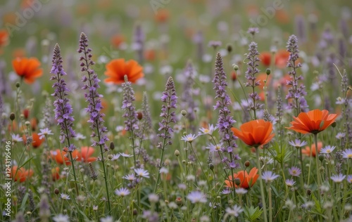 © Iqra, Obraz premium A meadow filled with purple and red wildflowers