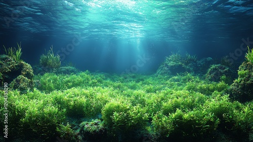 © typepng, Fototapeta premium A meadow hidden underwater with aquatic plants beneath a dark blue sea
