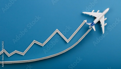 © 문용 최, Fototapeta premium A meandering upward curved graph, with a small model of an airplane following the top of the upward curved graph model