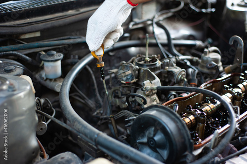 Obraz premium A mechanic checks the car and engine oil.