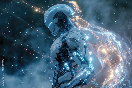 © Tanu, Fototapeta premium A mechanical figure against a backdrop of glowing lights, A robotic being with a cascading display of shimmering lights trailing behind it, AI generated