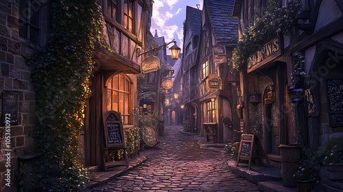 Fototapeta premium A medieval alleyway at dusk, lined with quaint, timber-framed buildings and cobblestone streets. Ivy creeps up walls, lanterns glow against moonlit shadows, signs hang above small shop entrances.