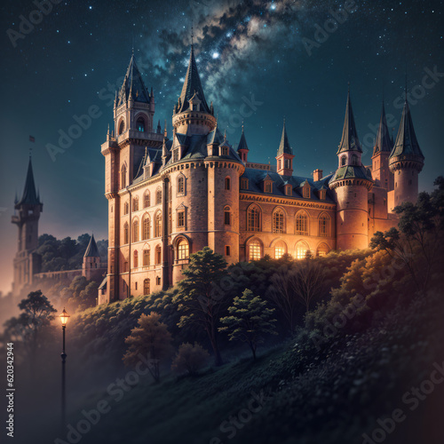 © Vitor, Fototapeta premium A medieval castle on a hill, surrounded by a dense forest (Day/Night) | Generative AI