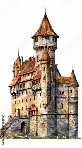 © Carl & Heidi, Fototapeta premium A medieval fantasy castle in an illustrated hand-drawn style, children's story book image, fairy tales, isolated on white, generative ai