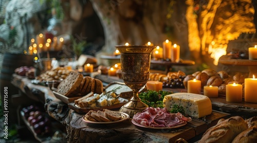 Naklejka premium A medieval feast table filled with bread, cheese, meat, and candles.