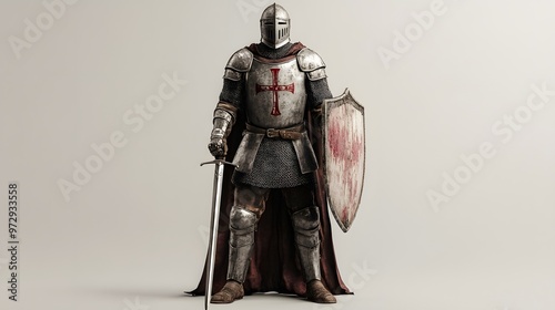 Naklejka premium 1. **A medieval knight in full armor, wielding a sword and shield, standing tall