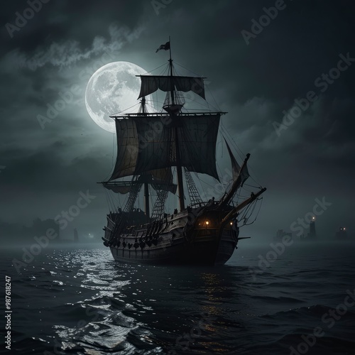 © Hashim, Fototapeta premium A medieval ship sailing in thick fog, illuminated by the moon, eerie and mysterious ambiance