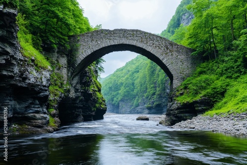 © Sanchai, Fototapeta premium A medieval stone bridge arching over a slow-moving river, surrounded by ivy-covered ruins