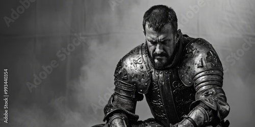 © Alena, Fototapeta premium A medieval warrior sits on a stool, dressed in armor and ready for battle
