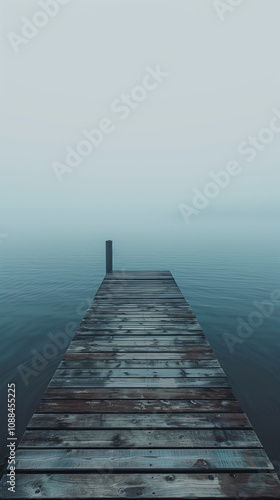 Fototapeta premium A meditative landscape of a mountain lake viewed from a small boat dock with fog in early spring or autumn. Perfect for screensavers or interior design.