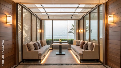 Naklejka premium A medium closeup of a serene lounge area featuring a glass partition that...