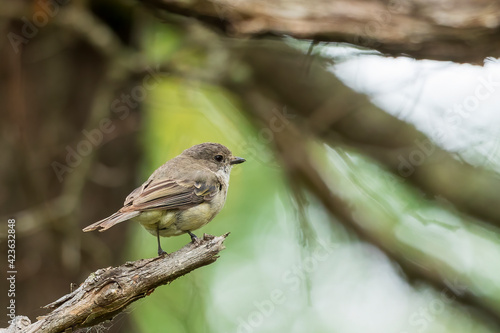 © wrightouthere, Naklejka premium A medium-sized reddish-brown stocky bird with a grey head and a whitish throat known as the Olive Whistler (Pachycephala olivacea).