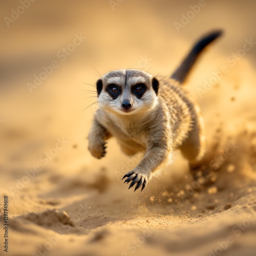 © Alex, Fototapeta premium A meerkat darting through sandy ground, its slender body moving swiftly