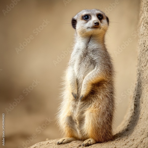 © Hassan Ahmad Kundi, Fototapeta premium a meerkat standing alert with front paws held together isolated on sandtone background animal communication theme