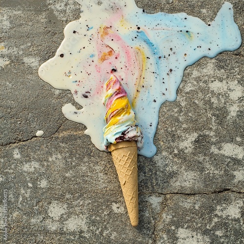 © Obsidian, Fototapeta premium A melting ice cream cone spills onto a gray concrete surface, creating a colorful and chaotic pattern.
