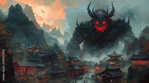 Fototapeta premium A menacing giant monster looms over a peaceful Asian village. The creature's dark form and glowing red eyes create a sense of impending doom.
