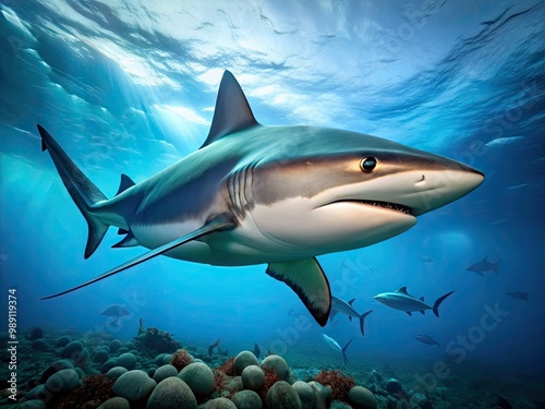 © sanom, Obraz premium A menacing grey reef shark swims vertically towards the camera, its sharp teeth and piercing gaze commanding attention in the crystal-clear blue ocean water.