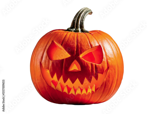 © PetalFlower, Fototapeta premium A menacing jackolantern glows against a stark white backdrop.