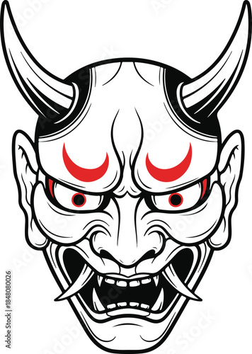 © Sojib, Fototapeta premium A menacing Oni demon mask with curved horns, glowing red eyes, and sharp fangs, intense and powerful vector illustration