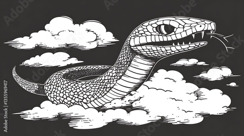 Fototapeta premium A menacing snake floats amidst fluffy clouds, rendered in a detailed hand-drawn style.