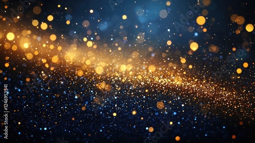Fototapeta premium A mesmerizing abstract digital artwork featuring glowing golden and blue light streaks with scattered bokeh particles. This design conveys energy, movement, festive ambiance, and futuristic aesthetics
