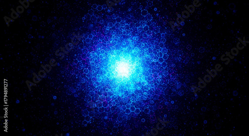 © abu, Fototapeta premium A mesmerizing abstract image featuring a vibrant blue light burst against a dark backdrop, adorned with a intricate hexagonal pattern, radiating energy and futuristic design.