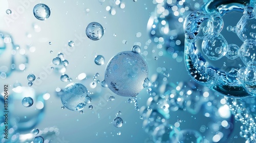 © MheeP, Obraz premium A mesmerizing abstract image of silver water molecules, forming intricate bubbles against a blue background.