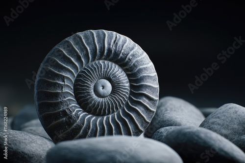 © Isuru, Obraz premium A mesmerizing ammonite fossil, showcasing its intricate spiral structure, rests on smooth dark stones.