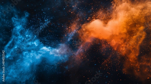 © Muhammad, Fototapeta premium A mesmerizing and dynamic composition of abstract blue and orange color powder splattered on a sleek black background