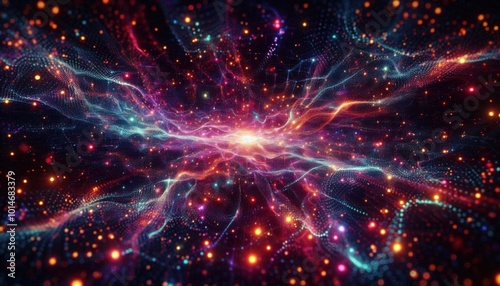 Naklejka premium A mesmerizing background filled with glowing particles swirling in neon colors, resembling a digital cosmos.