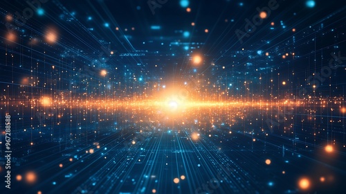 © Tackey, Fototapeta premium A mesmerizing burst of light in a digital universe, showcasing vibrant particles and dynamic energy waves.