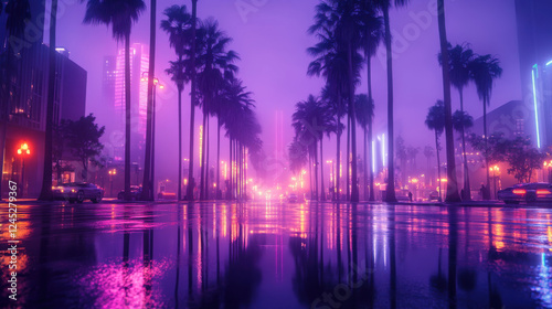 Fototapeta premium A mesmerizing city street at dusk, where vibrant neon lights cast an ethereal glow onto the sleek asphalt