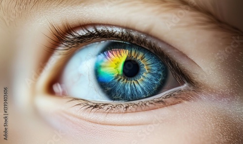 Fototapeta premium A mesmerizing close-up of a blue eye with a rainbow reflection reveals...