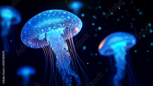 Fototapeta premium A mesmerizing close-up of glowing jellyfish floating in a dark, deep-sea environment.
