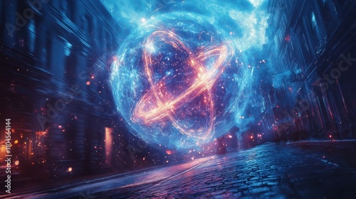 © nattapon, Obraz premium A mesmerizing cosmic sphere hovers above a dimly lit urban street, illuminated by vibrant blue and orange hues, Ideal for use in sci-fi themes, technology projects, or imaginative visuals,