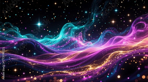 Fototapeta premium A mesmerizing cosmic swirl of neon colorsvibrant purples, electric blues, and golden streaksdance across a starry night sky, sparkling with twinkling stars and glowing particles in a dreamy, futuristi