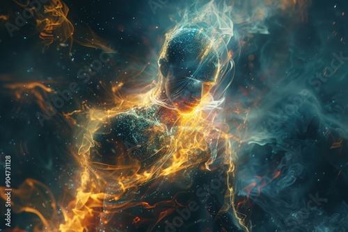 Obraz premium A mesmerizing depiction of a figure enveloped in swirling flames and ethereal...